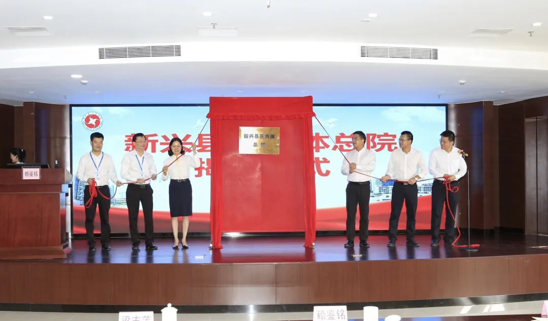 仪式上,赖鉴铭、梁志莲以及有关负责人共同为新兴县医共体总院进行揭牌。
