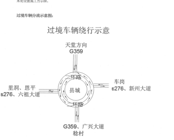 绕行路线建议:(1)过境车辆往天堂(稔村)G359方向无法经广兴大道通过,仅能通过二环路绕行到二环路该方向路口再出境;
