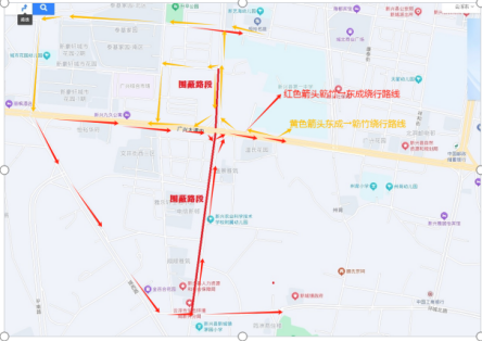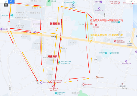 (2)途径升平路(大江福路口-广兴大道平交口)右幅,茅园路(广兴大道平交口-环城北路平交口)右幅进行围挡南北机动车分流绕行,建议如下: