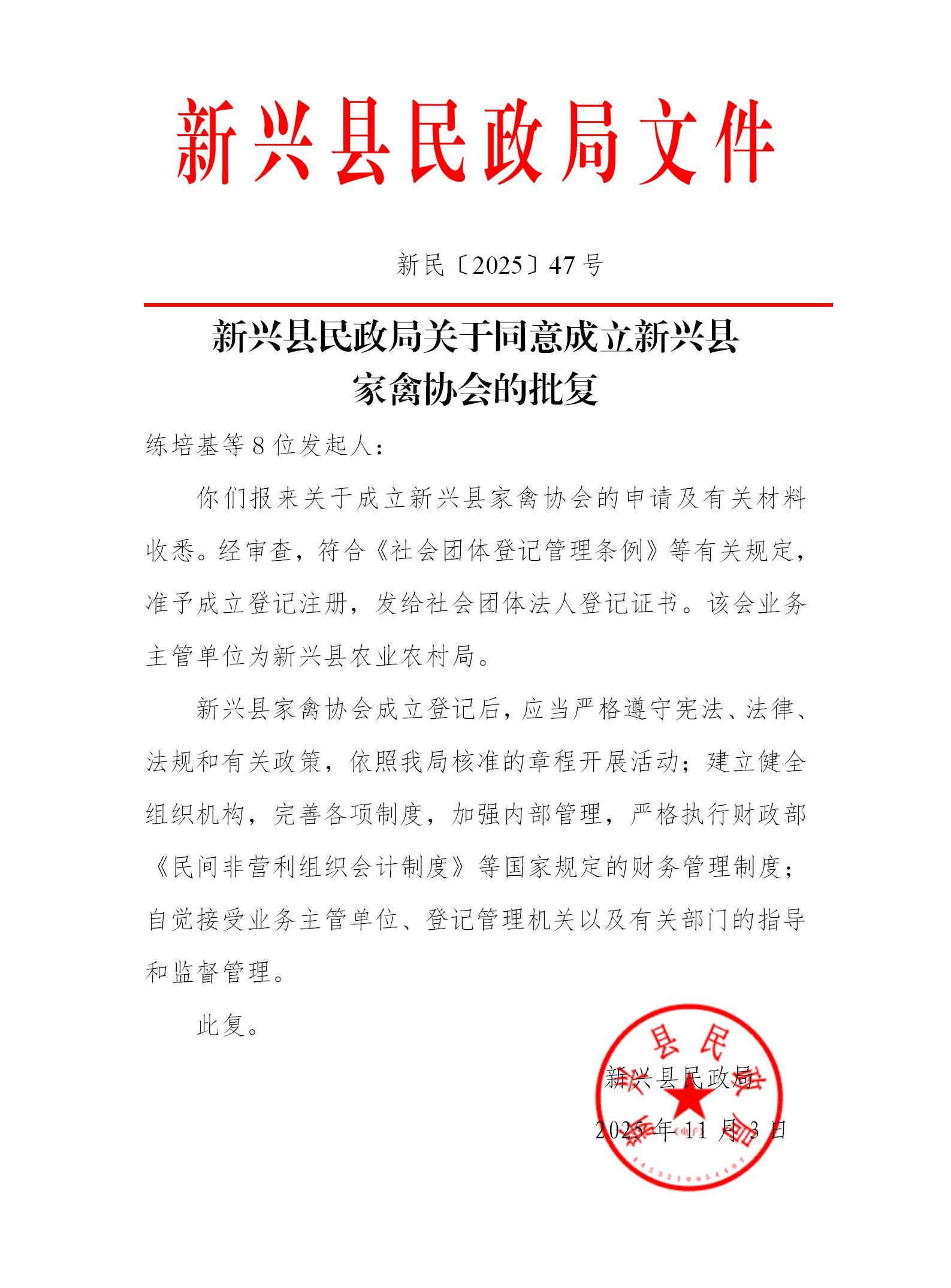 新兴县民政局关于同意成立新兴县家禽协会的批复