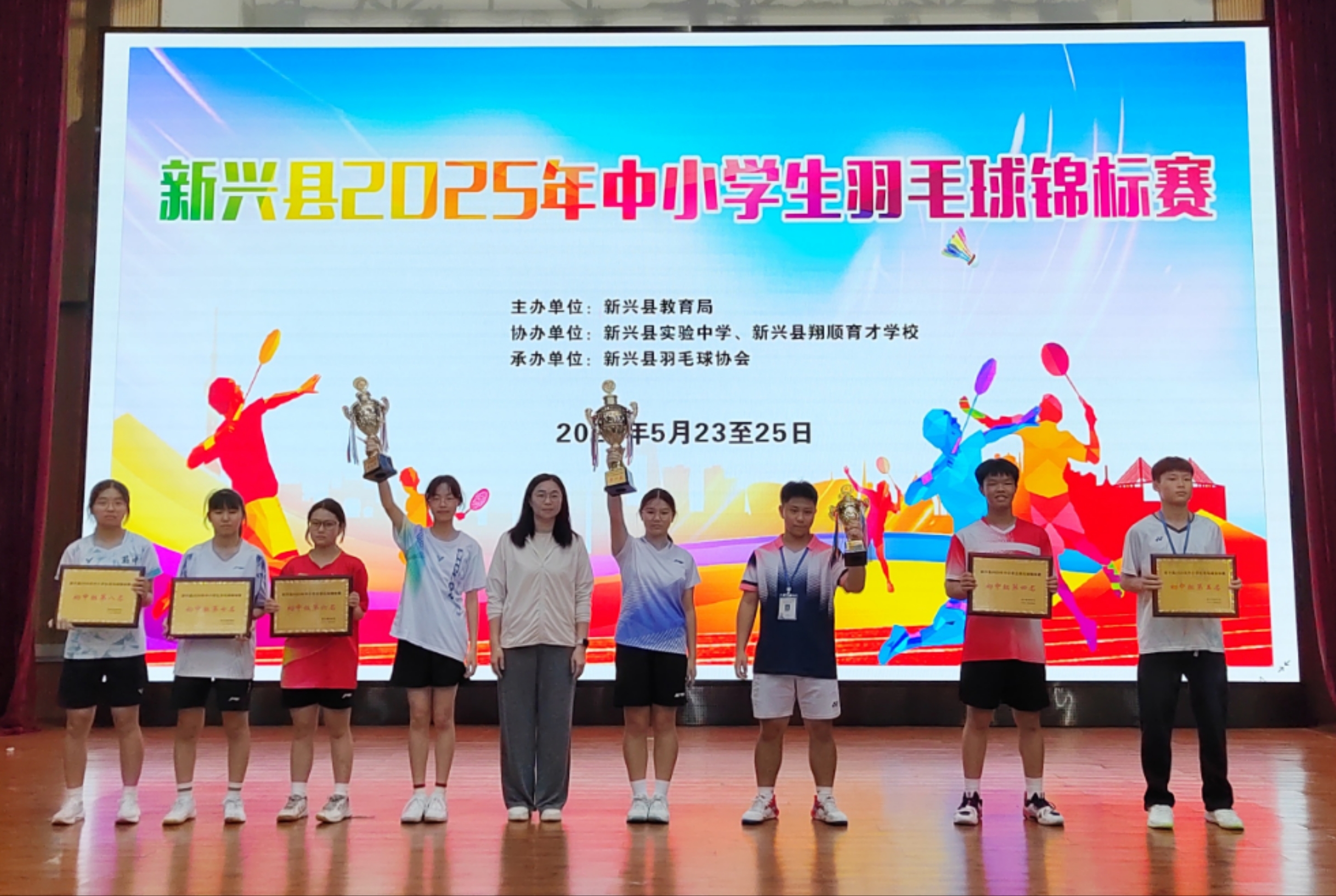 2025年5月23日至25日,由新兴县教育局主办、新兴县羽毛球协会承办的新兴县2025年中小学生羽毛球锦标赛,在县实验中学体育馆和翔顺育才学校体育馆隆重举行。全县34所中小学340名运动员,分别参加了中学组和小学组混合团体赛。经过三天的激烈角逐,中学组、小学组前八名最终揭晓,充分展现了新时代青少年蓬勃向上的精神风貌。25日下午,比赛在颁奖仪式中圆满落幕,县教育局领导为获奖代表队颁发了奖杯、奖牌。