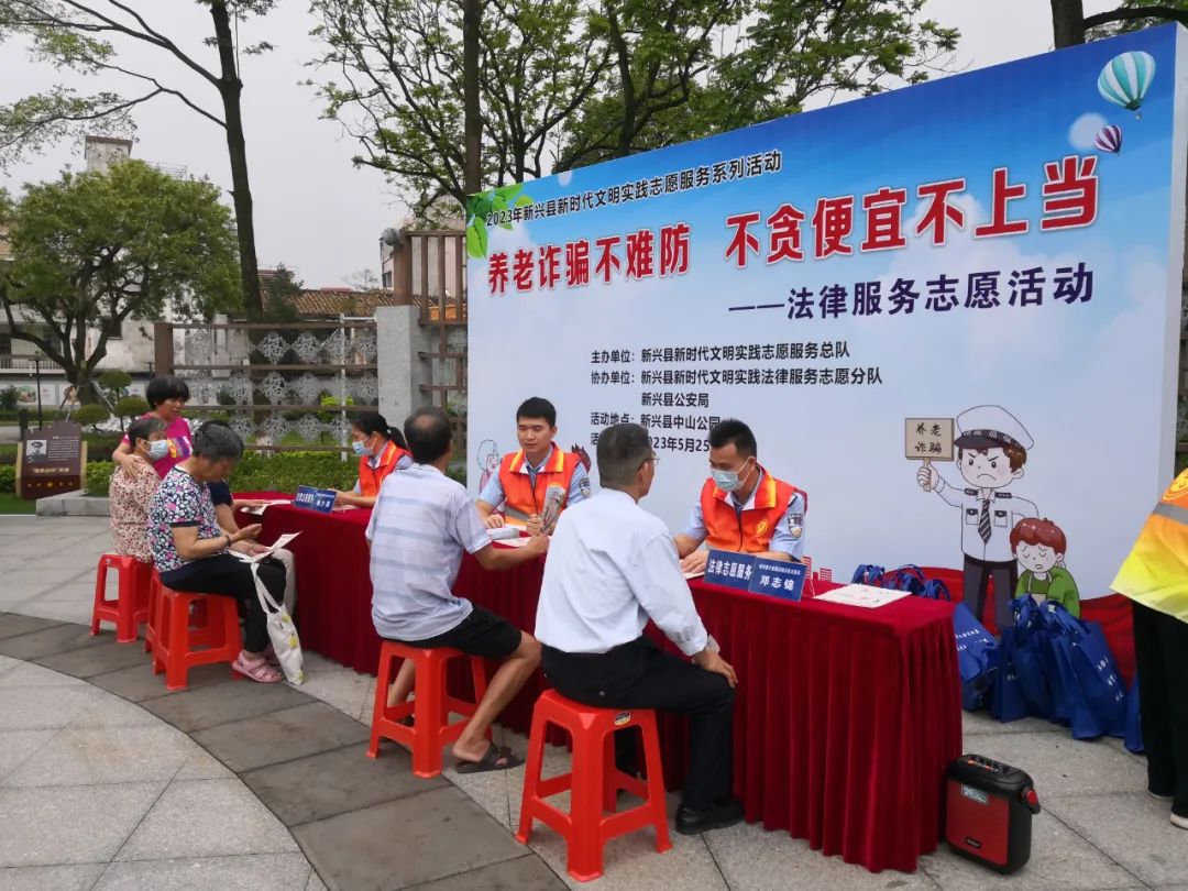 为切实保障老年人合法权益,提升老年人识骗防骗能力,积极发挥志愿使者专业所长,帮助老年人利用法律维权,扩大社区法律服务知晓度,5月25日上午,新兴县新时代文明实践志愿服务总队联合县公安局在中山公园开展“养老诈骗不难防 不贪便宜不上当”法律服务志愿活动。