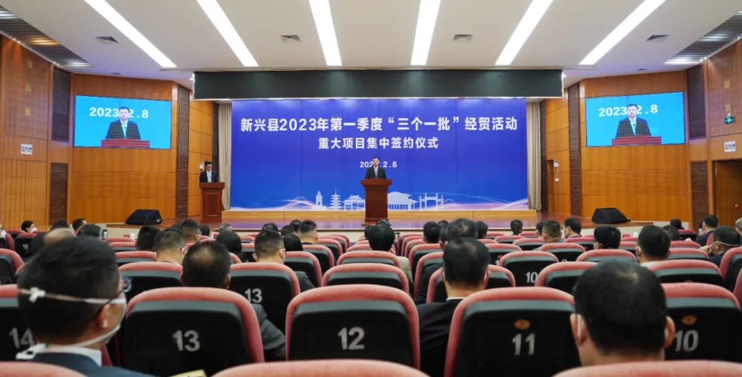 战鼓声声催奋进,旌旗猎猎踏征程。为深入贯彻落实党的二十大精神,全省高质量发展大会精神和云浮市高质量发展动员大会精神,全面打响“三大会战”,推动实现争先进位、跨越赶超。2月8日上午,新兴县举行 2023年第一季度“三个一批”经贸活动。县委书记陈哲江,县委副书记、县长赖鉴铭,县政协主席梁国华参加活动,县委常委、办公室主任李耀强主持签约仪式。