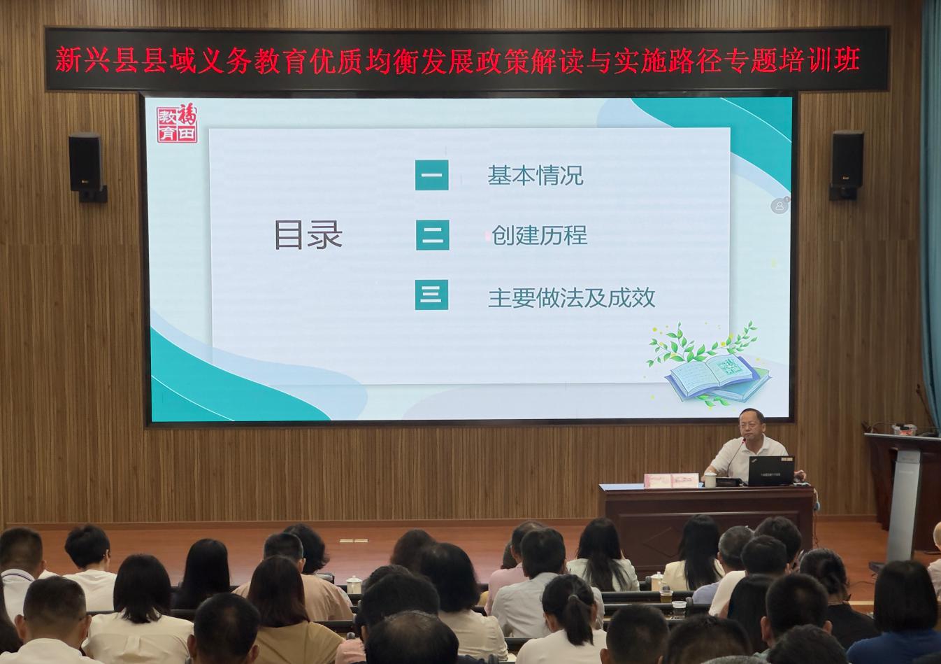 在实地诊断环节,专家团队深入新兴县第一中学、翔顺实验学校、新城镇中心小学等学校,通过设施核查、座谈交流等方式开展现场诊断,即时反馈发现问题、同步指导改进方向。以三所样本校为切入点,专家团队精准剖析县域内学校在师资配置、课程实施、硬件建设等方面的短板,靶向破解“优质均衡”创建中的堵点难点。7月15日的集中培训,专家团队在县教师发展中心以政策解读为纲、以评估指标为尺、以福田经验为鉴,系统讲解创建工作的政策内涵、实施路径、督导评估指标及实地评估要点等内容,重点分享了深圳在缩小校际差距、提升办学质量等方面的成熟做法,并在交流互动环节为我县创建攻坚阶段的重点工作指明方向。全县教育系统140余名管理骨干参加培训。